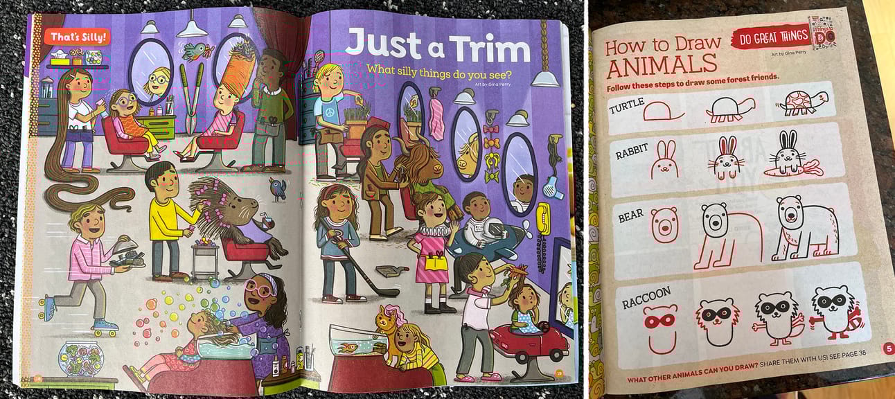 This is a rare, fun month where I have illustrations in both High Five and Highlights Magazines. You know I love to make step-by-step animal drawing sheets, so this woodlands page was a treat. And while I found the hair salon assignment very challenging, I’m happy with how it turned out and think kids will have a lot of fun finding the silly things (my favorite is the broccoli in the lollipop bowl!)