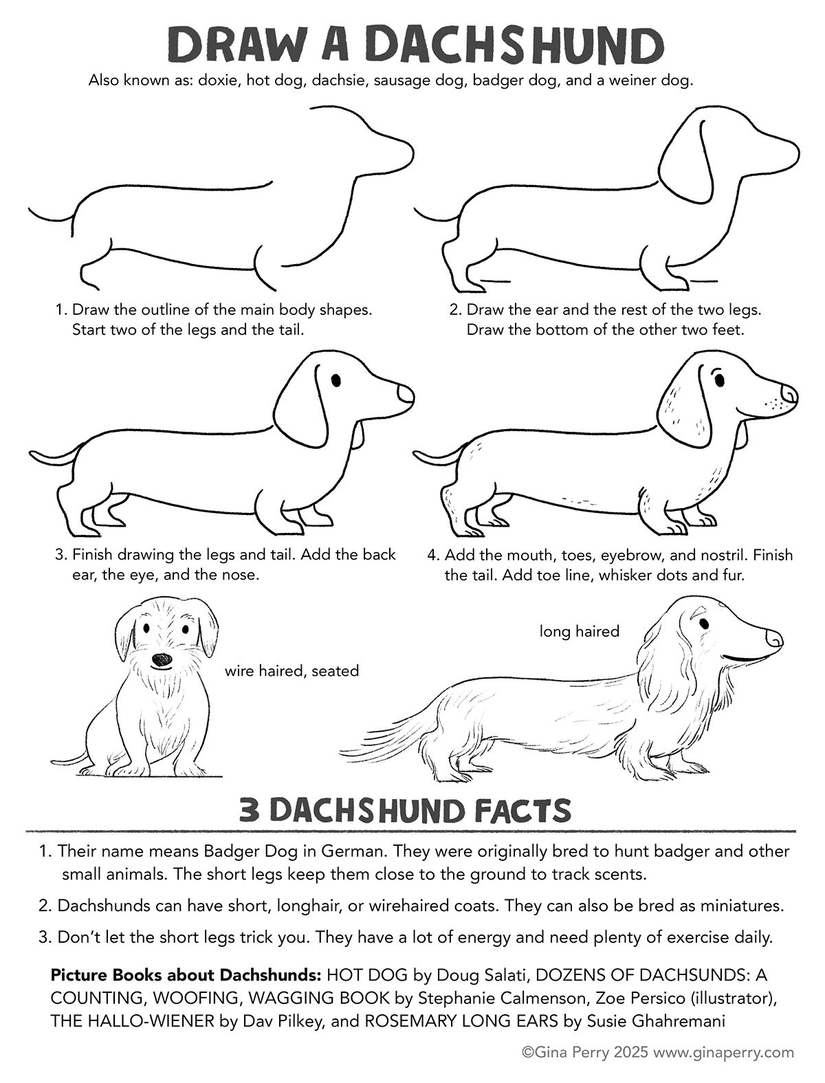 For nearly three years, I’ve focused on unique animals and adding some animal facts and/or book recommendations. It feels like time to mix things up. I’m going to focus on different dog breeds for a bit. This is something I’ve wanted to play with in my own work, and hopefully, kids will have fun with these too. I will still add in some facts and book recommendations. I’m starting with the adorable doxies.