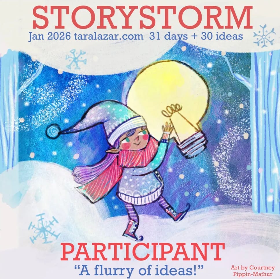 For many years, I have participated in Tara Lazar’s Storystorm challenge. I’ve been a fan since the early days when it was called PiBoIdMo (Picture Book Idea Month). For the uninitiated, every day of January has an inspiring blog post from other authors. You commit to writing down at least one picture book idea each day. It’s a great jump-start for writing each year, and really activates the weird-idea area of my brain! I highly recommend giving the challenge a try. This year’s badge illustration is by author-illustrator Courtney Pippin-Mathur.